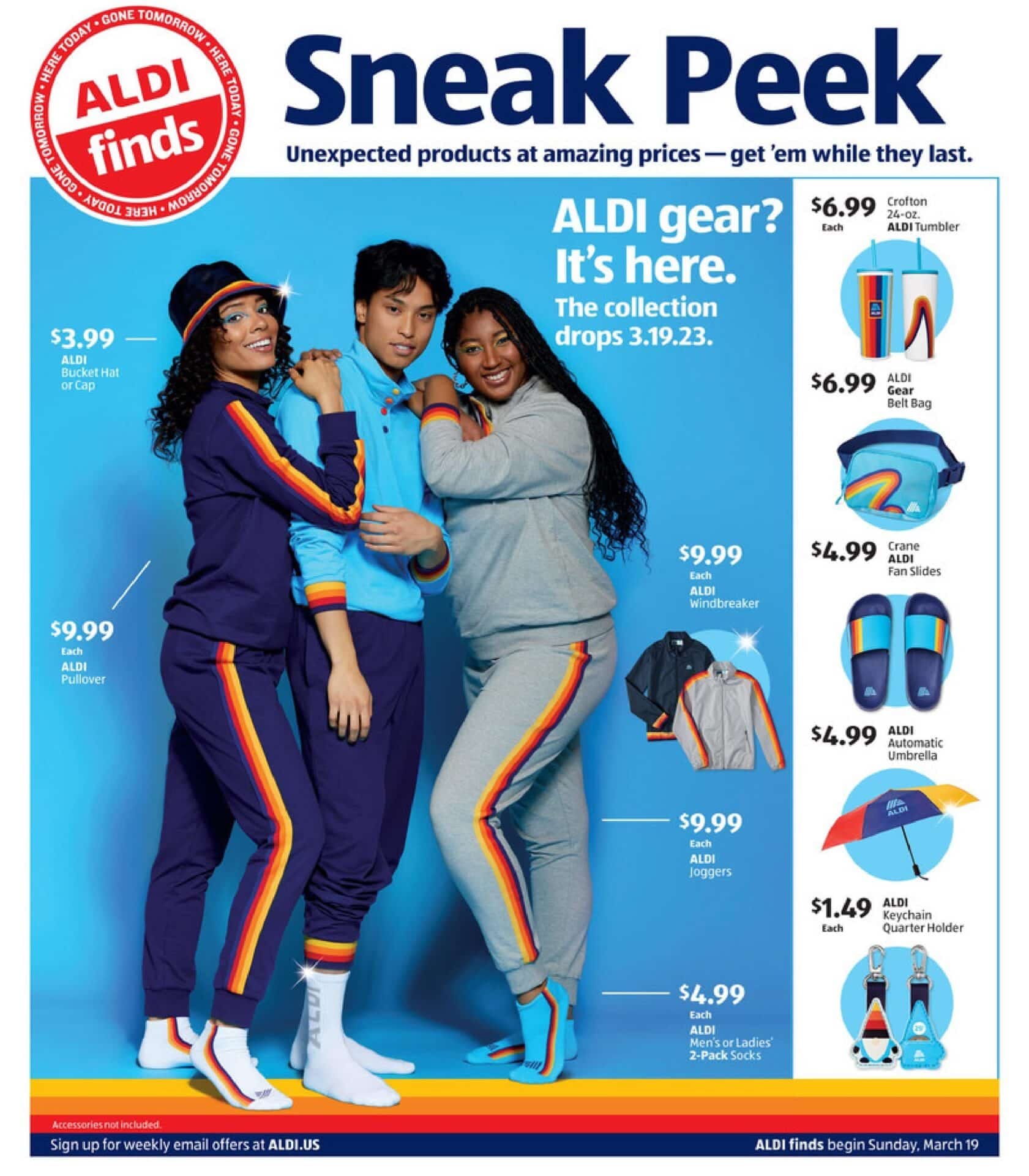 The limited-edition ALDI Gear Collection was available nationwide in ALDI Finds aisles while stocks lasted. ALDI Finds comprised temporary, specialty items ranging from unique foods to home goods, aiming to delight shoppers with innovative products.